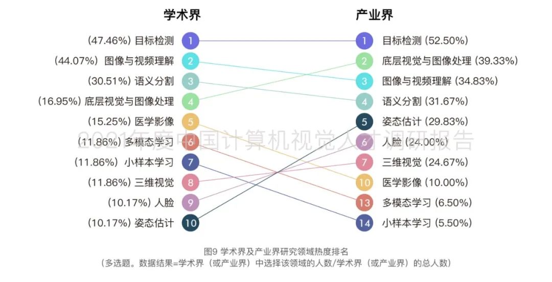 通过对比学术界和产业界在研究领域的差异后发现,产业界在姿态估计、人脸以及三维视觉等细分领域的关注度高于学术界,可见计算机视觉技术在这些研究方向的产业落地已有较多成功实践。