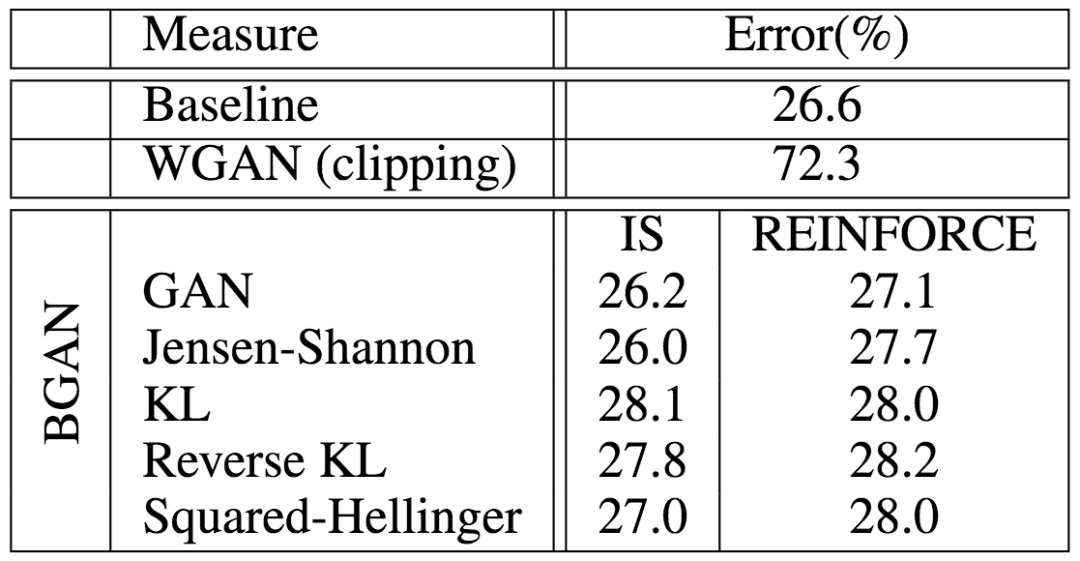 为了验证BGAN在离散设定下的表现,论文作者首先试验了在CIFAR-10上训练一个分类器。结果表明,搭配不同f-散度的基于重要性取样、强化的BGAN均取得了接近基线(交叉熵)的表现,大大超越了WGAN(权重裁剪)的表现。