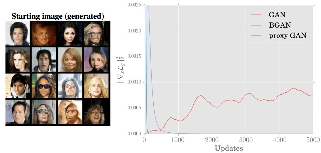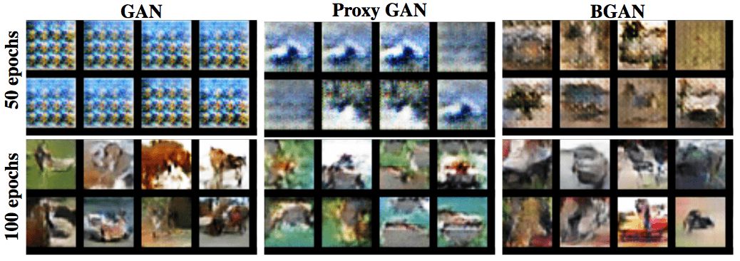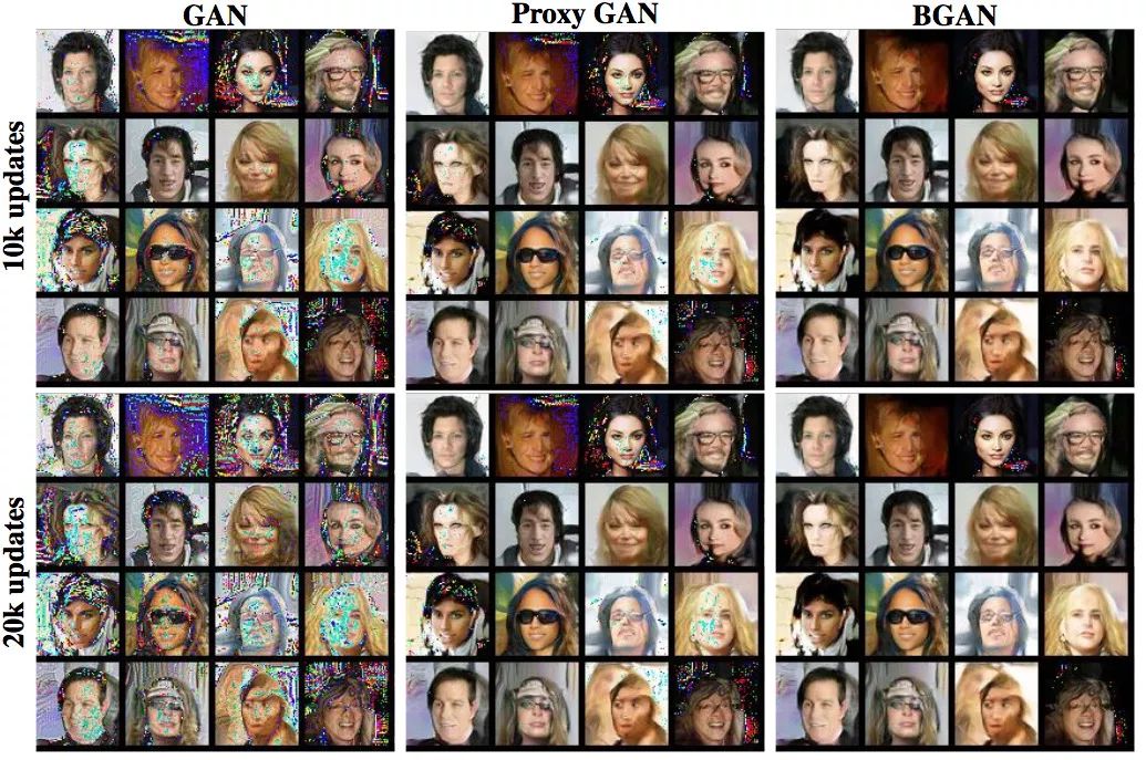 在CIFAR-10与原始GAN、使用代理损失(proxy loss)的DCGAN的比较表明,BGAN的表现和训练稳定性都是最优的: