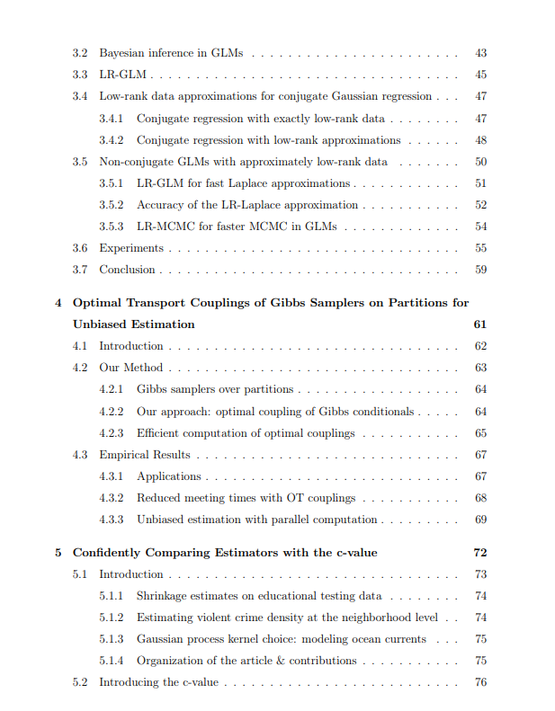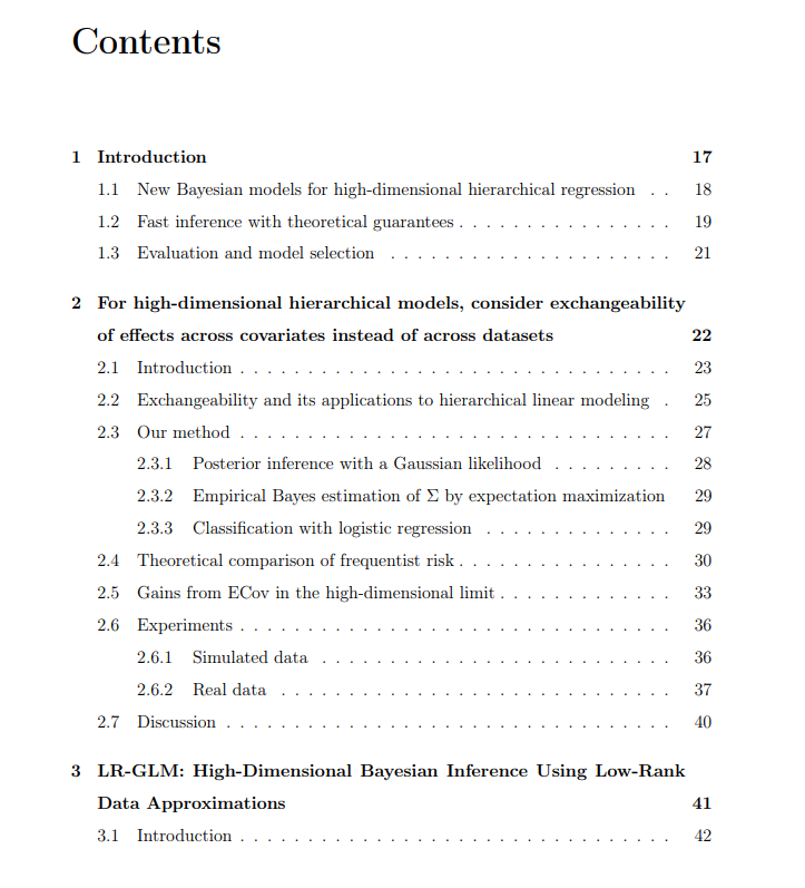 本文解决了在高维应用贝叶斯方法时出现的三个挑战。第一个挑战是如何应用层次模型(贝叶斯推断的支柱),在多个线性模型之间共享具有多个协变量的信息(例如,多种相关疾病的遗传研究)。论文的第一部分论证了默认的分层线性建模方法在高维情况下的失败,并提出了一种新的有效的模型。论文的第二部分解决了高维贝叶斯推理所带来的计算挑战——现有的方法要求时间与协变量的数量成超线性关系。我们提出了两种算法,通过利用(i)数据的低秩逼近或(ii)跨特定类别的马尔可夫链蒙特卡洛算法的并行性,允许快速、准确的推理。论文的最后部分探讨了评价的挑战。现代统计学为估计未知参数提供了广泛的工具,典型的贝叶斯分析通过相信主观先验假设来证明其估计。我们通过引入新的估计的置信度(“c值”)来解决这个问题,它可以诊断贝叶斯估计的准确性,而不需要这种主观主义。