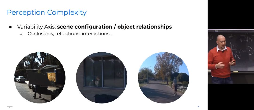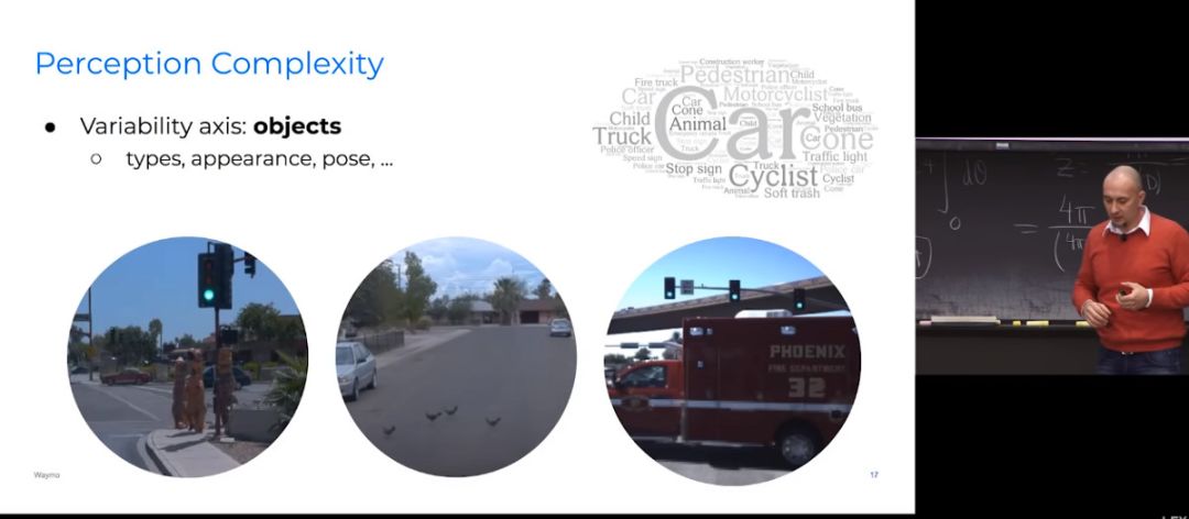 感知的复杂性还包括,很多不同的环境。比如,一天当中不同的时间段(白天/黑夜),不同的季节,不同的天气下雨或者下雪。这些都需要识别。