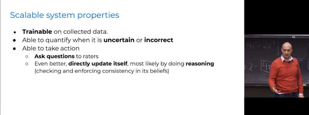 在一些好的训练步骤如下:对收集的数据进行培训;能够在不确定或不正确的情况下进行量化;能够采取措施,比如向评分者提问;更好的是,通过因果分析直接自我更新。