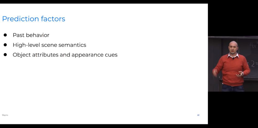 预测的影响因素有过去的动作、高度的场景语义、物体属性和出现提示。我们考虑周围的任何事物,比如有一个自行车想要通过,那么我们需要停下或者放慢速度让它通过,这就需要提前计划设计,做出安全的解决方案。同时,我们也要向周围的人和物发出信号。