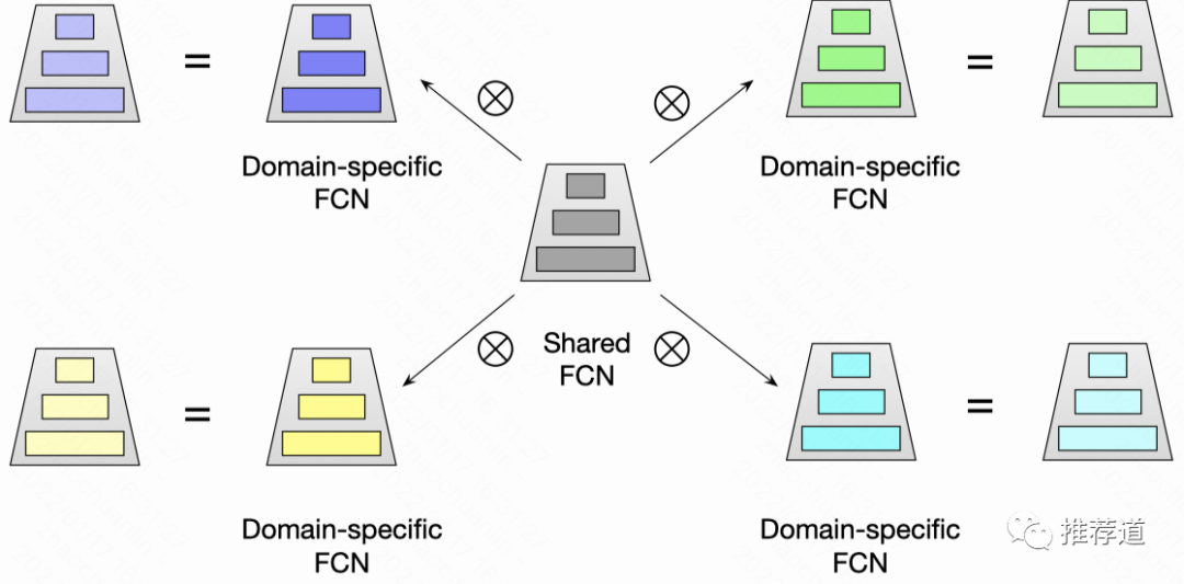 一篇是《One Model to Serve All: Star Topology Adaptive Recommender for Multi-Domain CTR Prediction》。这篇文章研究的是,如何训练并部署一个模型,就能胜任“首页推荐”、“猜你喜欢”等多个领域。前两个改进也很“直觉”(嘿嘿,知道我模仿的是谁吗?)