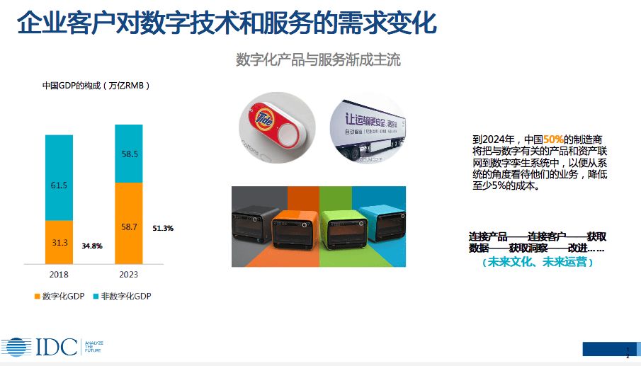 数字化产品和服务成为市场的主流,中国数字 GDP:2018年是34.8%,2023年达到51.3%。数字 GDP 的构成和机会涉及到两部分,一是产业的数字化,ICT、互联网公司,都是数字经济最核心的部分。二是数字技术加上传统行业改造升级。