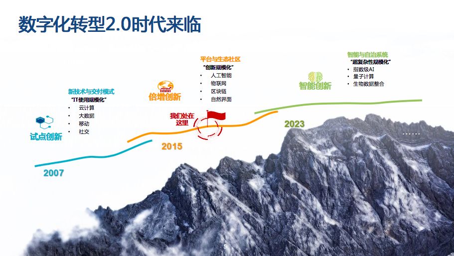 ,最核心的是除技术外,人工智能、物联网、区块链等新的自然接口出现,实现倍增创新,现在正处于这个时代,也就是数字化转型2.0时代。未来可能变成数字化转型3.0时代,实现智能创新,AI 被大规模应用在企业流程的方方面面,甚至也包括应用量子计算、生物整合等等。