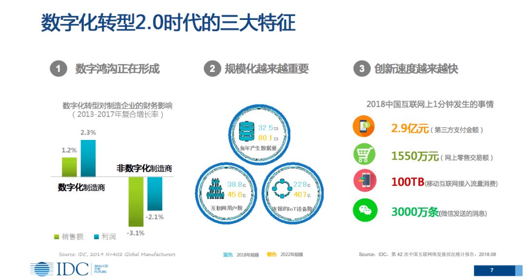 从2007年看 IT 的历程,出现了云计算、大数据、移动、社交,因此,IDC 将2007年那个时代叫第三平台时代,企业利用四个技术,实现试点创新。这算是数字化转型的1.0阶段。