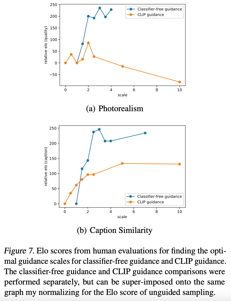 并将人类评估的结果和下表 1 的结果进行比较,然后该研究发现人类和 CLIP 指导给出的分数不一致,因此无分类器指导能够产生与人类认知一致的更高质量生成结果。