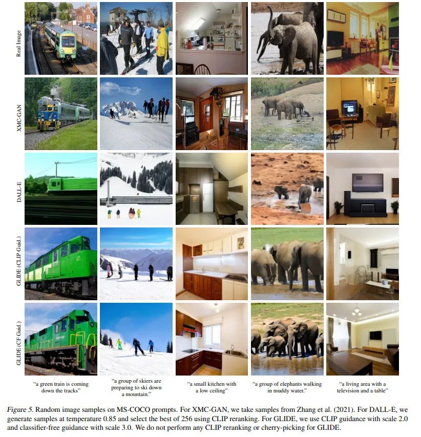 该研究将 GLIDE 与之前的 SOTA 模型进行了定性比较,结果如下图 5 所示。GLIDE 生成了更逼真的图像,并且无需 CLIP 重排序或挑选。