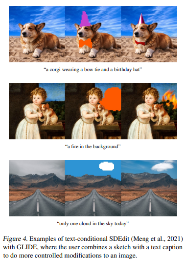 GLIDE 还能够将草图转换为逼真的图像编辑。例如下图中「一只戴着领结和生日帽的柯基犬」从涂鸦草图转换成了逼真的图像。