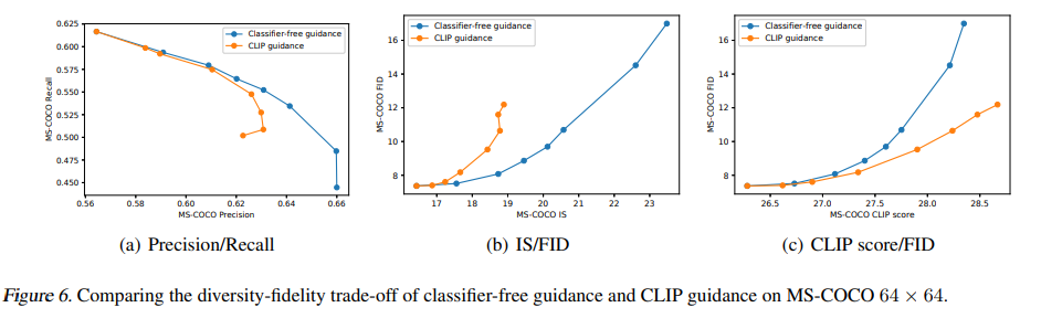 该研究首先通过查看图像质量保真度权衡的帕累托前沿来评估无分类器指导和 CLIP 指导之间的差异。下图 6 在 64 × 64 分辨率下评估了这两种方法的零样本 MS-COCO 生成。