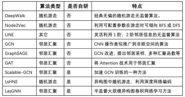 目前,Euler 内置的算法如下。除了 LINE 算法,Euler 实现的算法可以分为随机游走与邻居汇聚两大类算法,其中也有阿里妈妈团队自研的开创性算法。