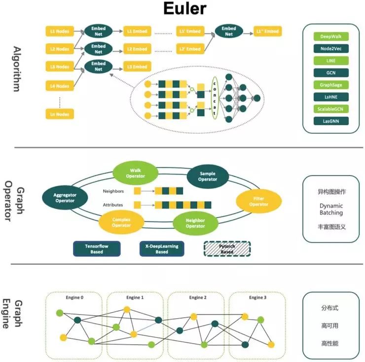 Euler 系统整体可以分为三层:最底层的分布式图引擎,中间层图语义的算子,高层的图表示学习算法。