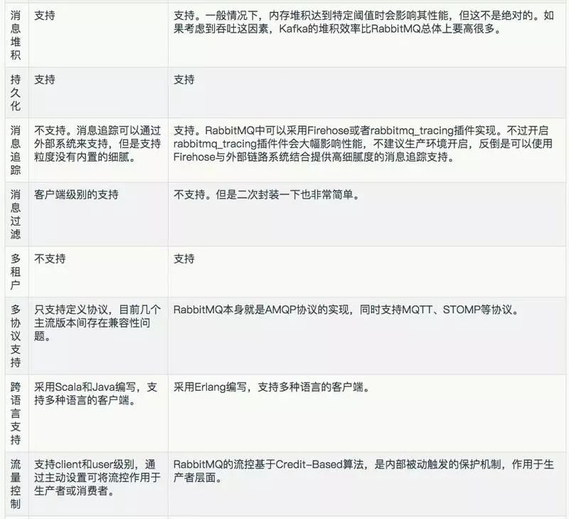 下表是对 Kafka 与 RabbitMQ 功能的总结性对比及补充说明。