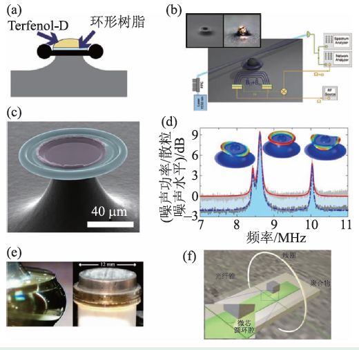 稳定的回音壁模式要求: 2πneffR =mλm ,其中neff是模式的有效折射率,R 是微腔半径,m是角量子数,λm是共振波长。自由光谱范围指其他量子数完全相同,只有角量子数相差1 的两个回音壁模式之间的频率或者波长间隔。精细度来源于Fabry-Pérot 标准具,用来衡量标准具的光谱分辨能力,定义为自由光谱范围与模式线宽之比。功率堆积因子用来描述腔内功率与输入功率之比,即对应着光子在腔内循环的圈数, 表达式为B = λQ/2π2nD ,其中n 为折射率,D 为微腔的直径。对于直径为50 μm、品质因子为108 的二氧化硅微腔,在1550 nm 波段微腔的功率堆积因子约为105。也就是光子在微腔内循环十万圈才耗散,因此在微腔内极大地增强了光与物质相互作用。