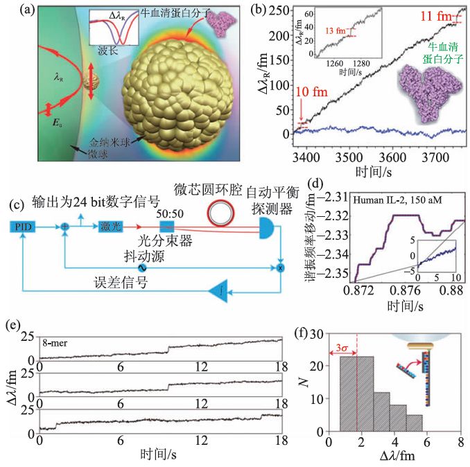 图6 生物单分子检测(a)基于局域表面等离激元杂化微腔的单个牛血清蛋白分子(BSA)探测结构示意图[52];(b)BSA 探测模式移动台阶信号;(c)PDH 锁模机制光路与电路示意图;(d)基于锁模机制的单个人类白细胞介素2 检测信号[35];(e)基于局域表面等离激元杂化微腔的单个核苷酸链分子检测模式移动台阶信号,(f)检测单个核苷酸链分子模式移动统计分布图[53]