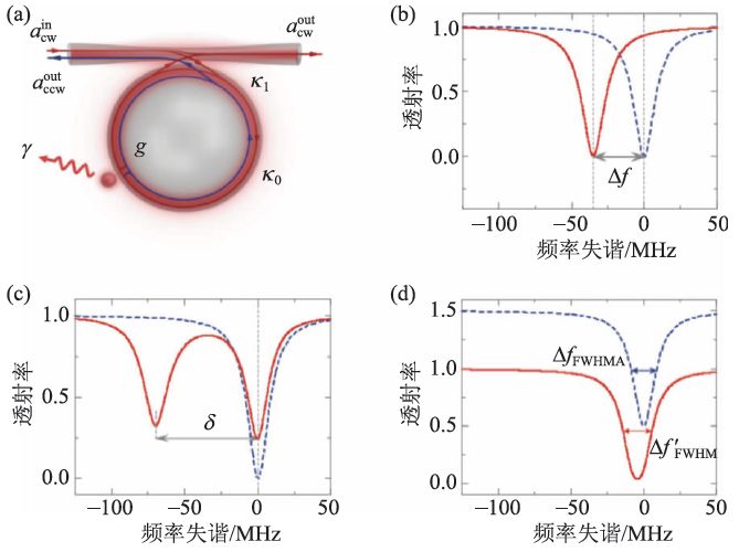 图4 回音壁微腔基本传感机制[3] (a)单纳米颗粒—微腔—光纤锥耦合系统。探测光经过光纤锥耦合到腔模中,腔模在传输谱上呈现洛伦兹线型。当纳米颗粒粘附到微腔上会引起:(b)模式移动;(c)模式分裂;(d)模式展宽