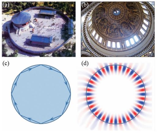图1 (a)北京天坛;(b)英国伦敦圣保罗大教堂;(c)微腔内光线全反射示意图;(d)回音壁模式电场强分布