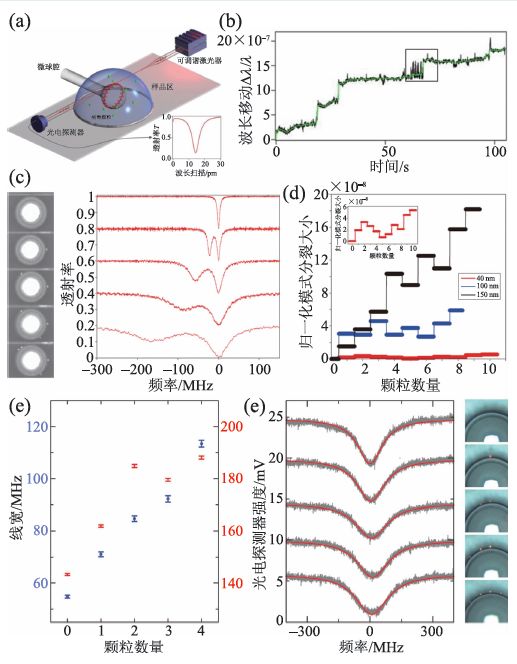 单纳米尺度颗粒探测对疾病的早期诊断、环境监测、易爆物品探测以及半导体制造工艺流程控制等应用方面具有重大意义。光学传感由于具有灵敏度高、成本低廉以及器件小等特点近年来受到广泛关注,目前光学传感方式如纳米波导传感器[46—49]、回音壁微腔传感器、光子晶体传感器[50,51]等已经成功用于单纳米颗粒检测。其中,回音壁微腔传感器由于其超高品质因子和小模式体积,可以极大地提高光与物质的相互作用,目前已经达到了单分子甚至单原子离子检测水平。回音壁微腔可以用来检测不同类型的颗粒,实验上通过利用聚苯乙烯、金纳米球、病毒或者二氧化硅等颗粒进行验证,检测的大小范围通常是几十到几百纳米量级。在2008 年,Frank Vollmer 等利用微球腔的模式移动机制成功实现了单聚苯乙烯颗粒和单个流感病毒(influenza A virus)的检测[22](图5(a,b)。在2010 年,Lan Yang 研究组也是通过检测聚苯乙烯小球颗粒验证了模式分裂传感机制的可行性,并同时验证了模式分裂可以得到纳米颗粒尺寸信息[24](图5(c,d))。在2013 年,北京大学肖云峰研究组也通过对聚苯乙烯颗粒和单病毒颗粒的检测验证了模式展宽探测机制的可行性[28](图5(e,f))。