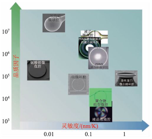 图7 几种典型微腔温度传感器的品质因子Q和温度传感灵敏度[5]