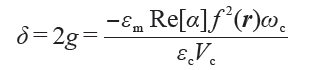 其中εm 、εp 和εc 分别代表微腔周围环境、散射体和微腔的介电常数。α 为散射体的极化率, 对纳米尺度球形颗粒α =4πR3(εp - εm)/(εp + 2εm) ,R 为颗粒半径, Vc 和ωc分别为回音壁模式体积和谐振频率, g 为正反行波模式之间的耦合强度。