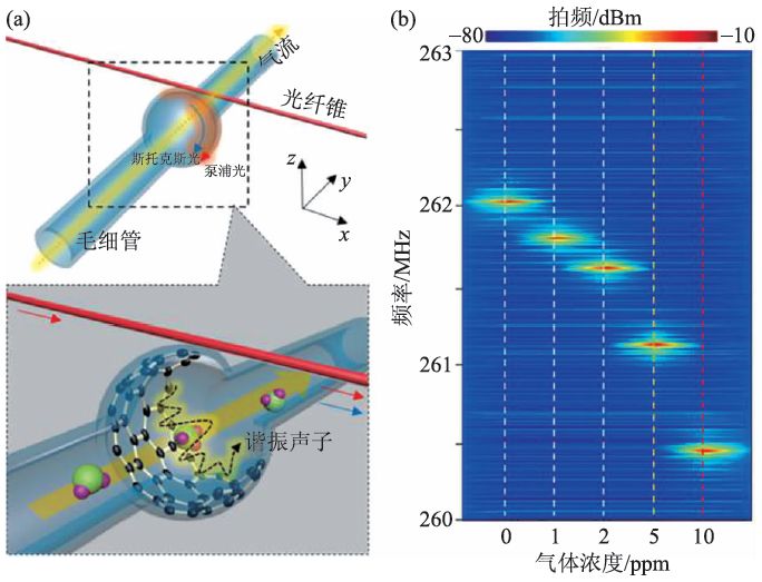回音壁模式微腔在化学气体传感领域运用也比较广泛。通常在微腔表面覆盖一层具有某种化学气体特异性识别功能材料如聚合物层,当待测气体与功能材料接触后会导致功能材料的折射率等物理参数的变化,一般通过检测回音壁模式谐振波长的移动判断气体的存在与否或者进一步获取气体浓度等信息。目前回音壁微腔可以成功用于检测氨气[42,76]、二硝基苯酚气体[77]、乙醇气体[78—81]和氦/氩气[82]等。其中,在2007 年B. Yao 等人利用将石墨烯材料放入微泡腔内部如图10 所示,利用其布里渊光机械模式实现了超高灵敏度的氨气检测[42]。