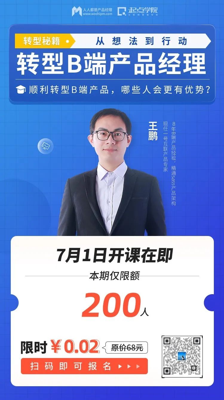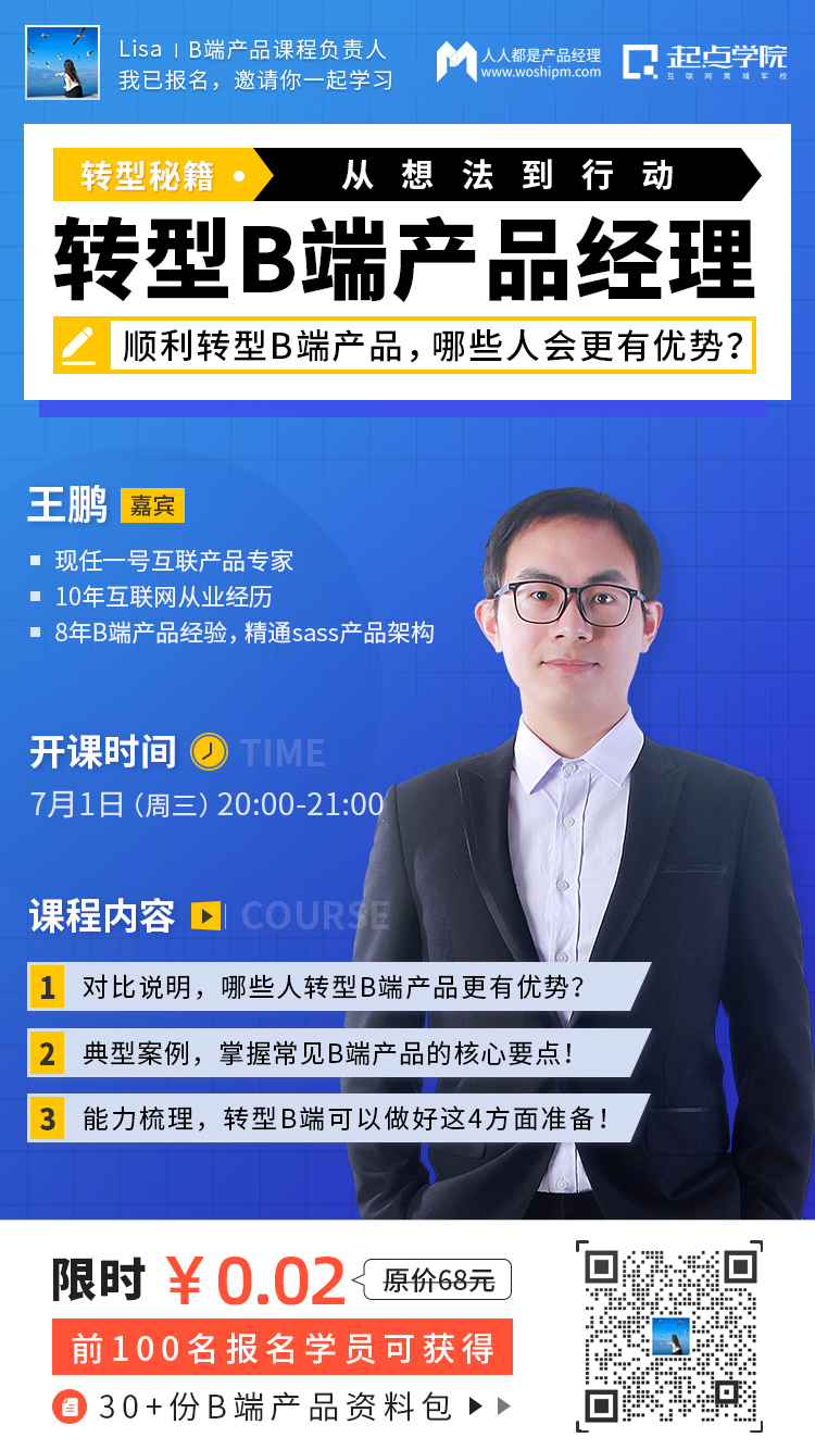 为了帮助大家更好的了解转型B端产品必备的能力准备,人人都是产品经理社区&起点学院特邀拥有8年B端产品经验,现任一号互联产品专家的王鹏老师,用1个小时的时间,跟大家分享一下不同岗位转型B端产品的优劣势以及转型B端需要做好4个方面的准备。