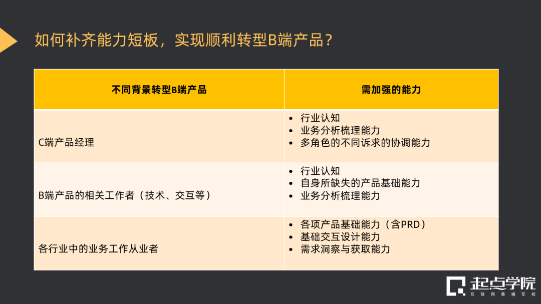 C端到B端的意识转变(①流量思维到服务思维、②B端产品经理要有成本思维)、深耕行业的经验积累、梳理业务的逻辑能力、掌握基础的B端专业技术知识和规则等等。