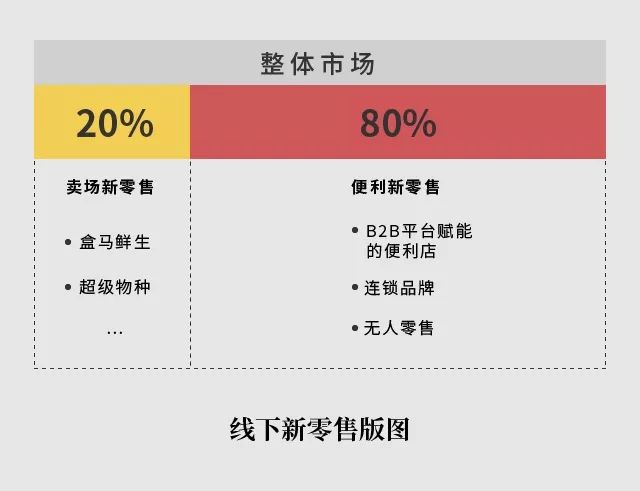 他认为,新零售版图中,20%市场份额是卖场新零售,代表就是盒马鲜生和永辉的超级物种等大卖场。剩下的80%,为便利新零售,主要力量包括三股,分别是给小店赋能的B2B平台、连锁店、无人便利店。