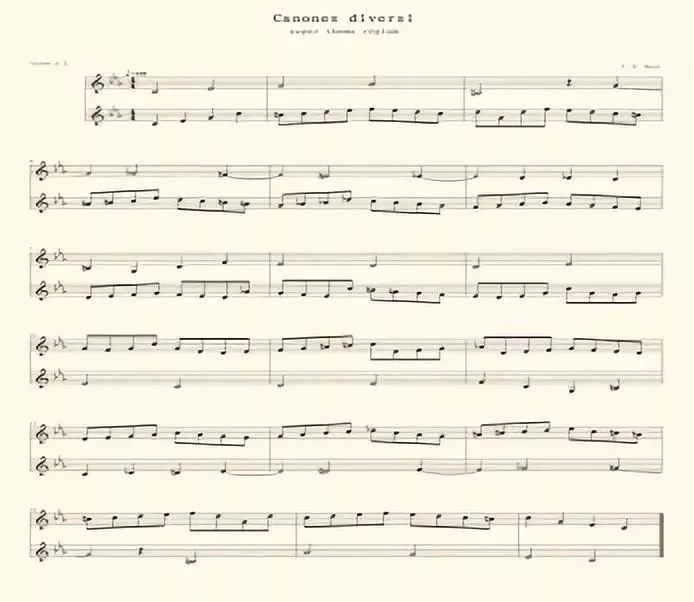 我们甚至在音乐作品中,也能见到回文的影子。如巴洛克时期著名的德国作曲家、管风琴演奏家巴赫(Johann Sebastian Bach,1685年3月21日-1750年7月28日)的作品《音乐的奉献》(英语:The Musical Offering; 德语:Musikalisches Opfer, BWV 1079)中的“Thema Regium”(“国王的主题”) [1]。这首曲子源自于巴赫与腓特烈二世在1747年5月7日波茨坦国王住处的一次会面。因为巴赫的作曲很有名,国王席间便为巴赫提供了一段长而复杂的音乐主题,命他作首三声部赋格。完成后,国王又让其作首六声部的。巴赫回家两个月后,便完成了国王的任务,称为《音乐的奉献》组曲。其中“国王的主题”很特别,它的旋律即可以正着演奏,也可以逆着演奏,且可以将正的和逆的作成两个声部同时演奏,因而叫“镜像卡农”。因为这样的旋律走向很像螃蟹走路,也将其称为螃蟹卡农, 而非回文的命名。还有人把这种旋律看成是一种莫比乌斯带上的循环。据说巴赫业余时间喜欢读他同时期的、但已声名大震的数学家莱布尼兹的著作,说不定他这种数学味很浓的组曲的灵感来自于莱布尼兹,因为后者曾说过“音乐是数学在灵魂中无意识的运算”。