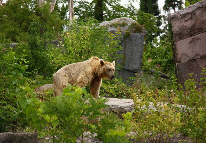 MS CaptionBot [Tran et al. '16]:一头大棕熊穿行在森林中。