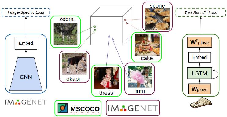 我们希望能够描述在图像-句子对训练数据中未见过但与之类似的物体(如 ImageNet 中的物体)。我们使用密集词嵌入(dense word embedding)来达到该目的。词嵌入是词密集的高维表征,意义接近的词在嵌入空间中比较接近。在我们之前的工作「深度合成字幕(Deep Compositional Captioning,DCC)」[1] 中,我们首次在 MSCOCO 成对图像-字幕数据集上训练字幕模型。然后,为了描述新物体,我们对于每一个新物体(如霍加狓鹿)都使用词嵌入方法来确定一个在 MSCOCO 数据集所有物体中与新物体最相似的物体(在此案例中该物体是斑马)。之后,我们将该模型学得的参数从已见过的物体传输(复制)到未见过的物体(即将斑马对应的网络权重复制到霍加狓鹿)。