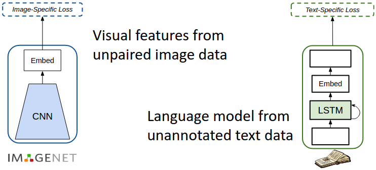为了给图像-字幕训练数据之外的多种物体生成描述,我们利用了外部数据源。具体来说,我们使用带物体标签的 ImageNet 图像作为非成对图像的数据源,将没有标注的文本语料库(如 Wikipedia)中的句子作为我们的文本数据源。它们分别用于训练我们的视觉识别 CNN 和语言模型。