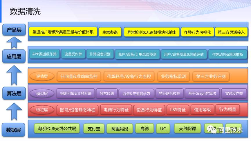 在特征层之上,我们会有模型层, 这里面有基于业务规则的模型,也有其他的例如异常检测,有监督或者无监督的学习,然后特征的联合校验等模型。因为我们的数据源非常多,因此我们也可以通过部分的数据源验证另外一个数据源,看数据的增长或者留存是否处于一个正常范围。另外还有一些比较好的方法,比如基于Graph的一些算法,实时的反作弊算法等等。在算法层之上,就是评估层。在评估层内,我们可以判断留下来的数据是否是真正有效的数据。