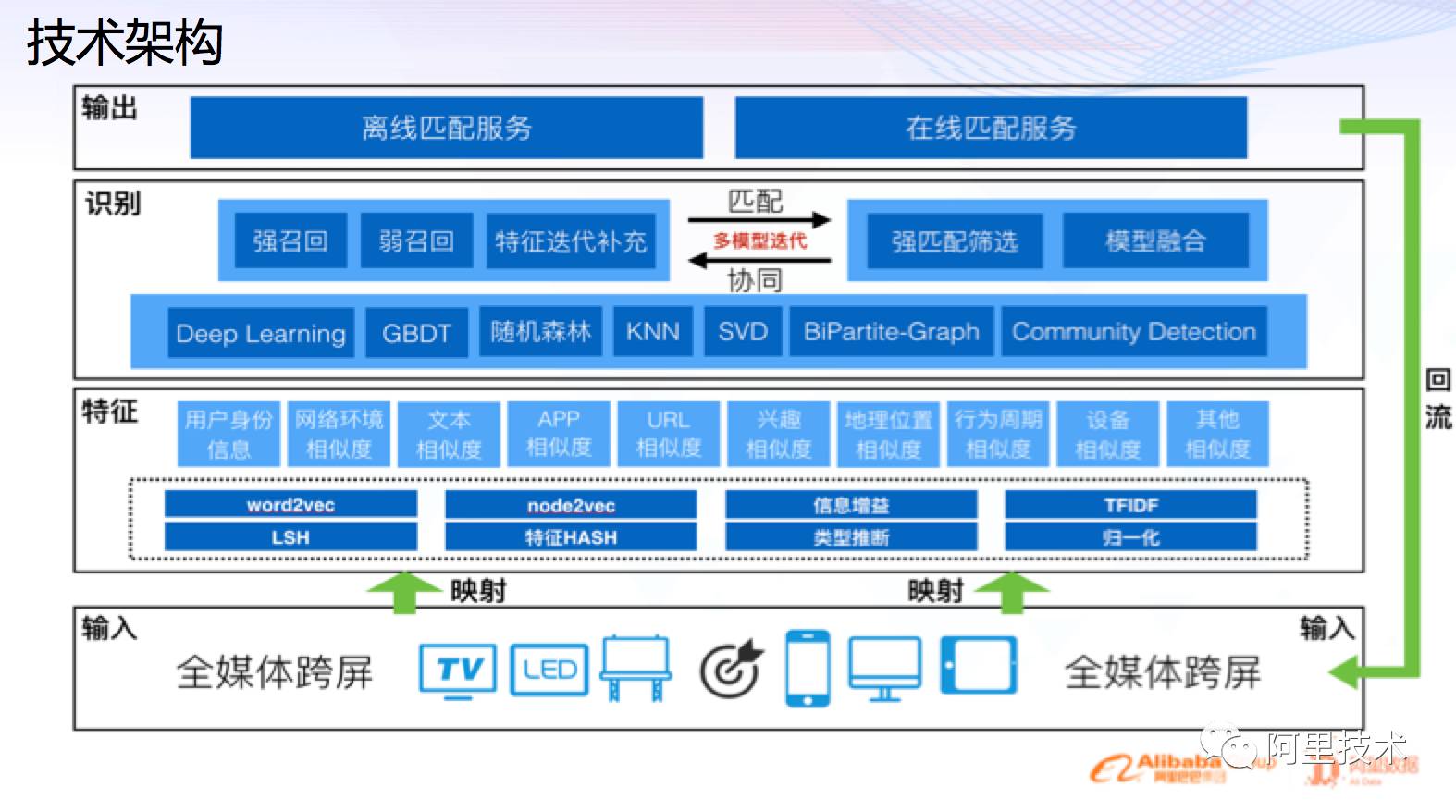 上图是这是我们关于怎么把数据打通的一个技术架构。大家可以看到,整个技术体系都是,先把数据接进来,再通过一些机器学习或者深度学习的办法(像word2ve,node2vec, TFIDF,归一化等)处理特征层,之后映射到一些比较抽象的高纬度Level(比方说像用户的身份信息,网络的环境相似度,文本的相似度,APP相似度等等)。抽象完这些特征层之后,我们究竟怎样去判断。