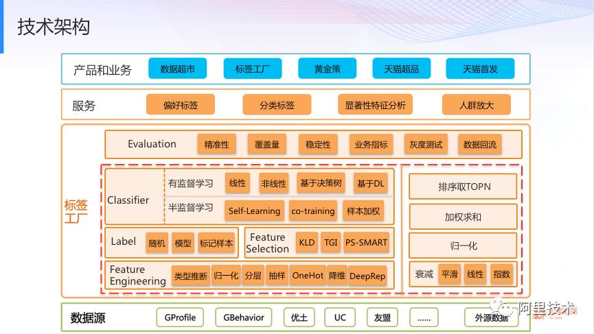 第一,数据源。你可以认为,整个数据新能源的数据源都是接到下面,经过数据清洗、打通之后,来到一个标签工厂的体系。在标签工厂,首先会进行一定特征学习(feature engineering),比方说有一些像类型判断、分层、降维,因为数据量非常大,通过深度学习,深度表征去学习出特征之间的非线性关系,和它们之间的high order interaction。