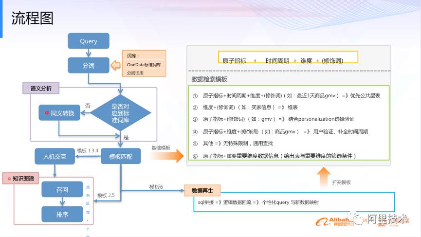但是,我们这个场合下一定要反馈唯一的、准确的表。所以,接下来我们会有一些模板匹配,所以这里非常重要的一部分是人机交互这一块,把人机交互的结果,就是人要告诉你说,这个结果是否是他想到的,然后知识图谱整个刚才的框架有效的结合在一起,然后产生出你真正想找到那张表,然后整个的这个过程,其实这些是一些抽象出来的模板,这些模板可能是不够的。因为随着人的查询越来越多,模板也需要慢慢的扩展。现在我们还是基于一些规则判断一些模板,未来我们也会尝试,让这个机器自动产生一些模板。