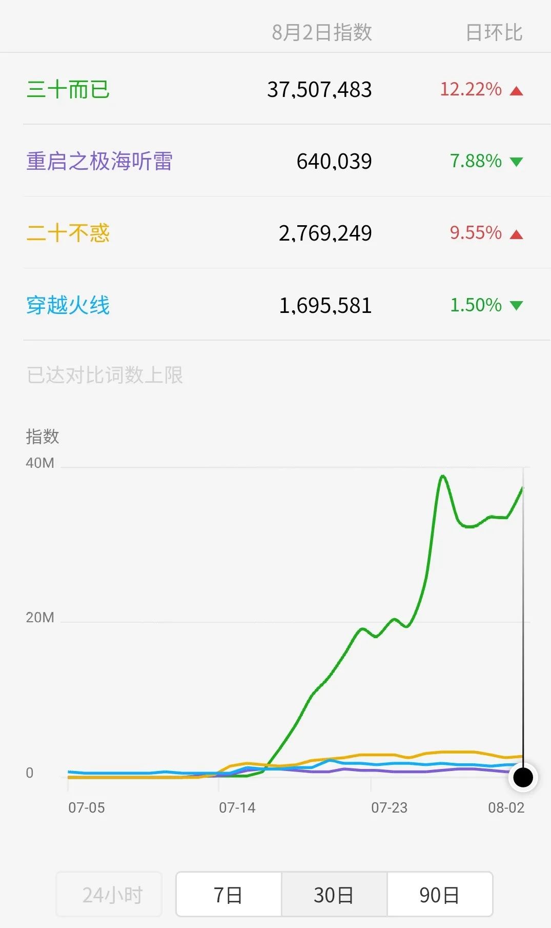 在各大数据网站上,《三十而已》也霸占了各种榜单。骨朵数据显示,8月3日,《三十而已》以82.19的全网热度位列连续剧市场第一;另外据猫眼专业版,其上线以来已连续16天登上电视剧单日热度榜首位。