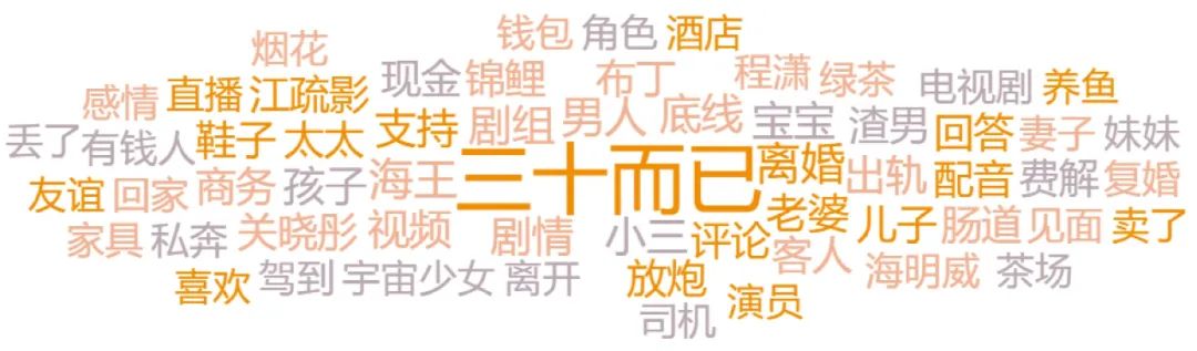 在微热点(微博旗下新媒体传播大数据应用平台)搜索《三十而已》可以发现,与该剧相关的全网关键词云中,离婚、小三、出轨、绿茶、渣男、海王等词热度较高。