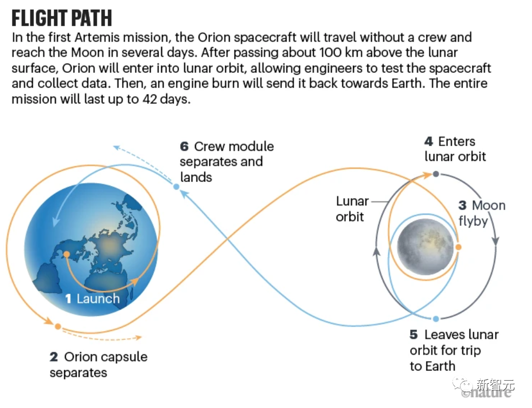在飞行期间,猎户座太空舱将前往「绕月远距离逆行轨道」。它将航行64000公里掠过月球,方向正与与月球的公转轨道方向相反。