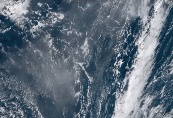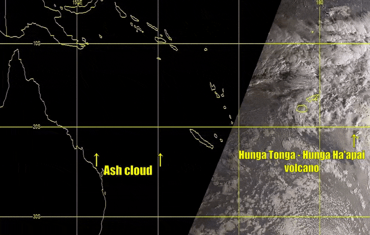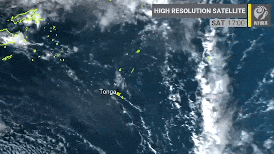 这段来自新西兰国家水和大气研究所的卫星图像视频显示,喷发的火山灰羽流笼罩着汤加的主要岛屿汤加塔布岛。