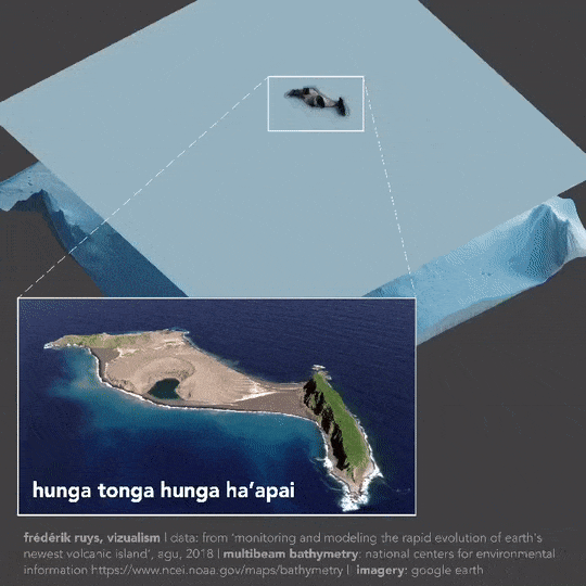 对此,荷兰数据可视化分析师frédérik ruys根据美国地球物理学会和美国海洋大气管理局的勘测数据绘制了汤加海底火山的3D模型。