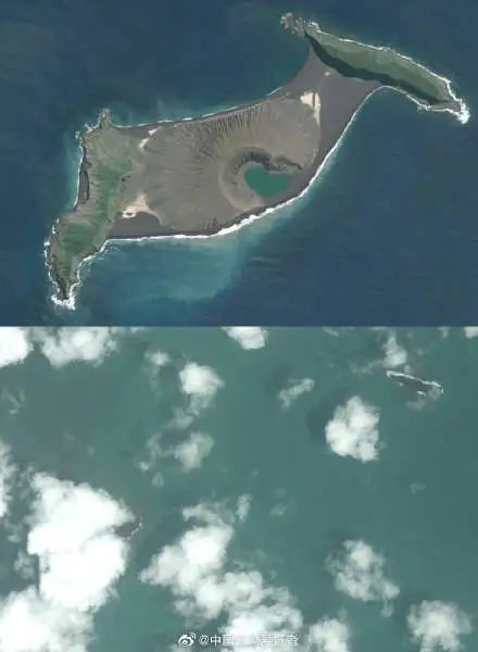 喷发后拍摄的卫星图像显示,连接的火山锥已被基本摧毁。此后,汤加气象局向全国所有岛屿发出海啸警告,火山爆发后记录到的海浪最高达30厘米。
