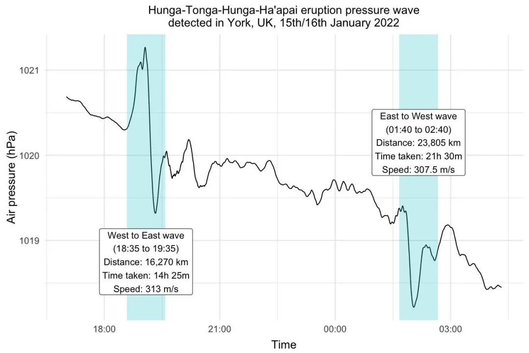 包括新西兰、澳大利亚、美国和英国的地震台都记录到了火山喷发产生的气压激增,并观察到了两次冲击波。