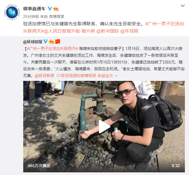 目前,国家外交部领事保护中心官方微博@领事直通车发文表示:「驻汤加使馆已与朱健雄先生取得联系,确认朱先生目前安全。」