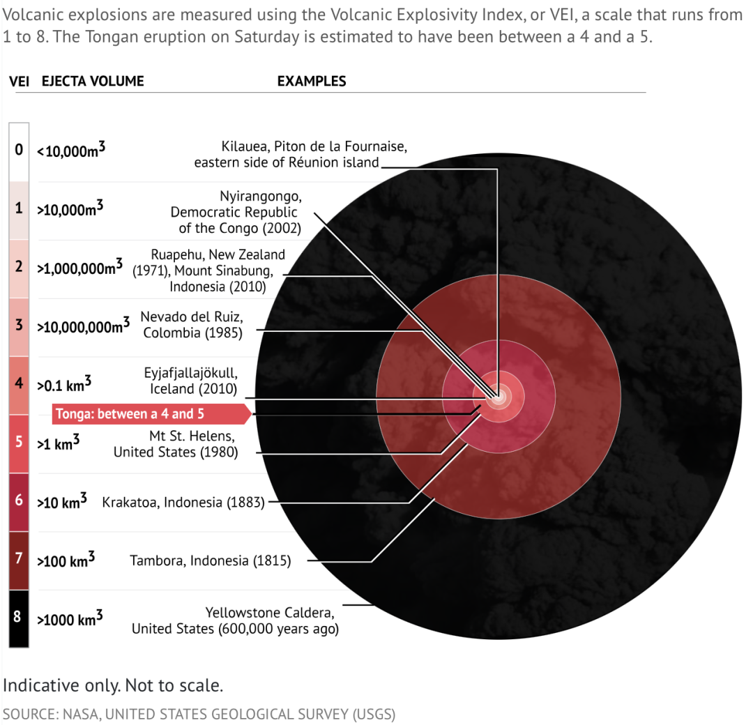 这次堪称是21世纪全世界最大规模的火山爆发,释放的能量相当于一千颗1.6万吨TNT当量的原子弹(小男孩)同时爆发,略等于世界上引爆过的最大「沙皇核弹」当量的三分之一。