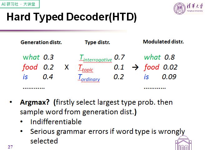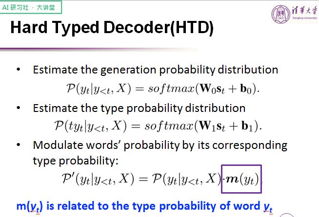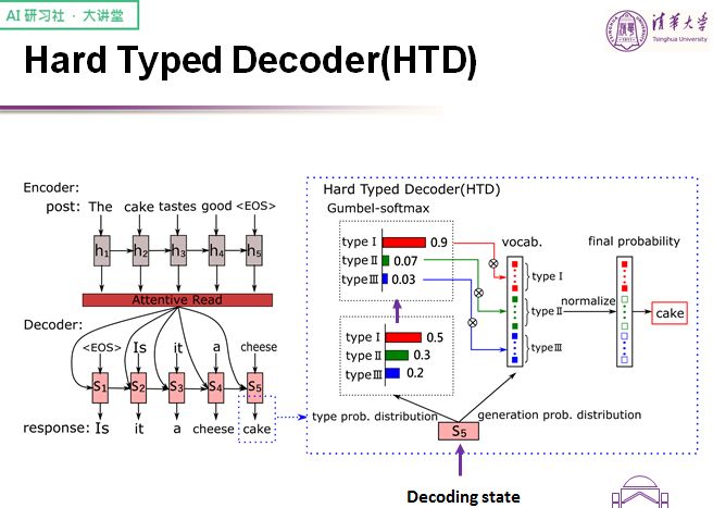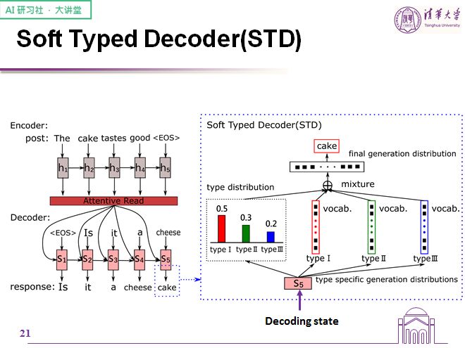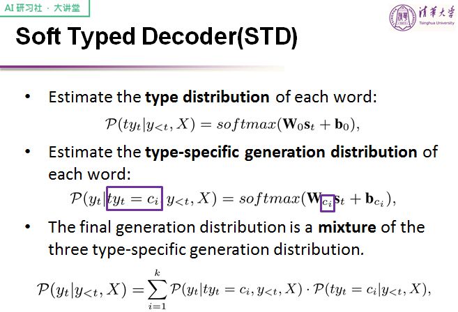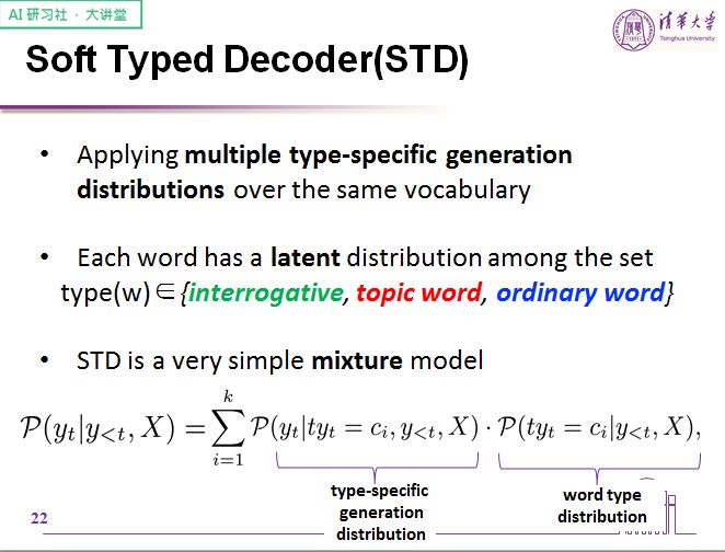 我们首先看弱类型化解码器 STD,对于当前的解码状态,我们会通过一个信息层估计每一种词(疑问词/话题词/普通词)并据此生成概率分布。我们假设每一个词都有能力充当某种类型的词,所以会维护三个内容相同的类型词表。每一种类型的解码会先预测这个词表中每个词出现的概率,再对当前解码位所需要的词语类型概率进行一个预测,最后将二者结合起来得到最终的词表概率分布,取其合纵最大的一个作为生成词。在同一个词表中使用不同的分布,每个分布都会有对应的类型,于是我们使用一个混合策略,将这些概率分布混合起来。