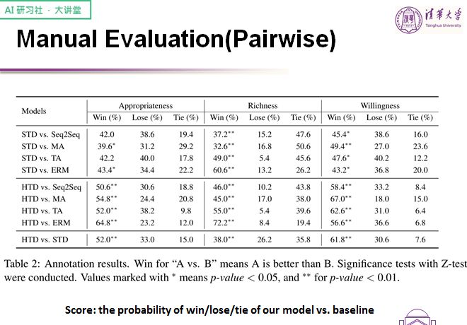 我们主要通过两两对比的方式进行评测,评价主要由以下三个指标组成:合适性、丰富性、回复意愿。在这个环节上我们的模型也取得显著的结果,其中强类型解码器要优于弱类型解码器。