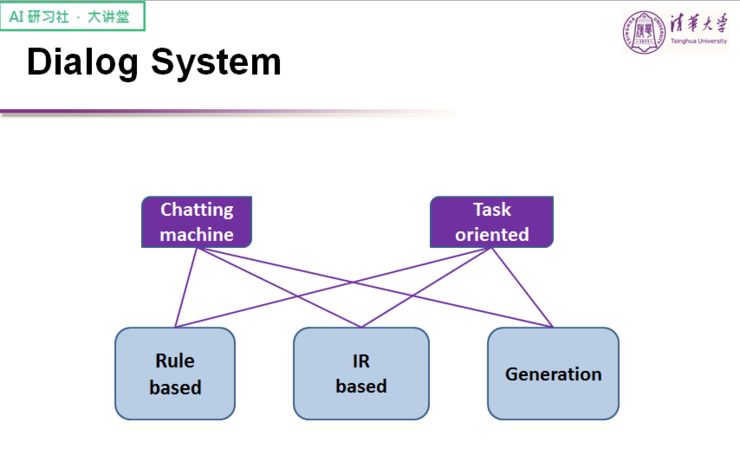 从解决方法上来说,对话系统又可以分为:基于规则、基于检索和基于生成。基于规则的特点在于会提前设好模式(pattern),需要的时候会根据模式进行回复;基于检索则是通过模型训练或者模型学习,从已有的样本中挑出最好的回复;基于生成指的是通过深度学习或者机器学习的方式,让训练样本可以针对不同输入而给出不同的回复。