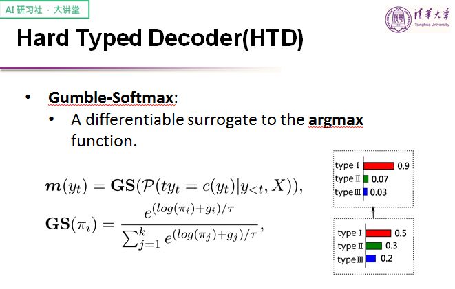在强类型解码器中,只存在一个词表,词表被分为 3 个部分,每个部分对应不同的类型。我们先预测某个类型上的概率分布,再利用 gumbel-softmax 做锐化,使其起到类似 gate 的作用,最后利用 gate 去调适整个词表上的概率。
